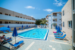 Bij de accommodatie is echter geen zandstrand maar rotsen, waardoor je of gebruik moet maken van het zwembad of naar het dorp moet lopen (~ 20 min.) De kamers liggen verspreid over verschillende gebouwen op het terrein.