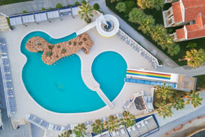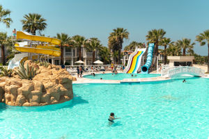 2 grote zwembaden waarvan 1 met 3 glijbanen en een kinderbadje plus zandstrand
